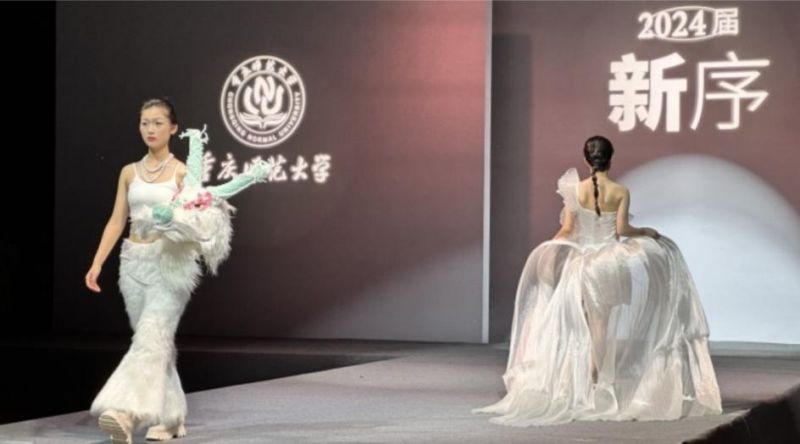 本次活動以“新序”為主題,100余件服裝畢業(yè)作品圍繞重慶市墊江區(qū)牡丹、角雕、竹編等文化元素展開。畢業(yè)生以服飾為媒介,融入地方文化元素進行設計,展示了重慶師范大學美術學院在學生教學方向、設計創(chuàng)新理念、藝術審美等培養(yǎng)方面的創(chuàng)新成果。